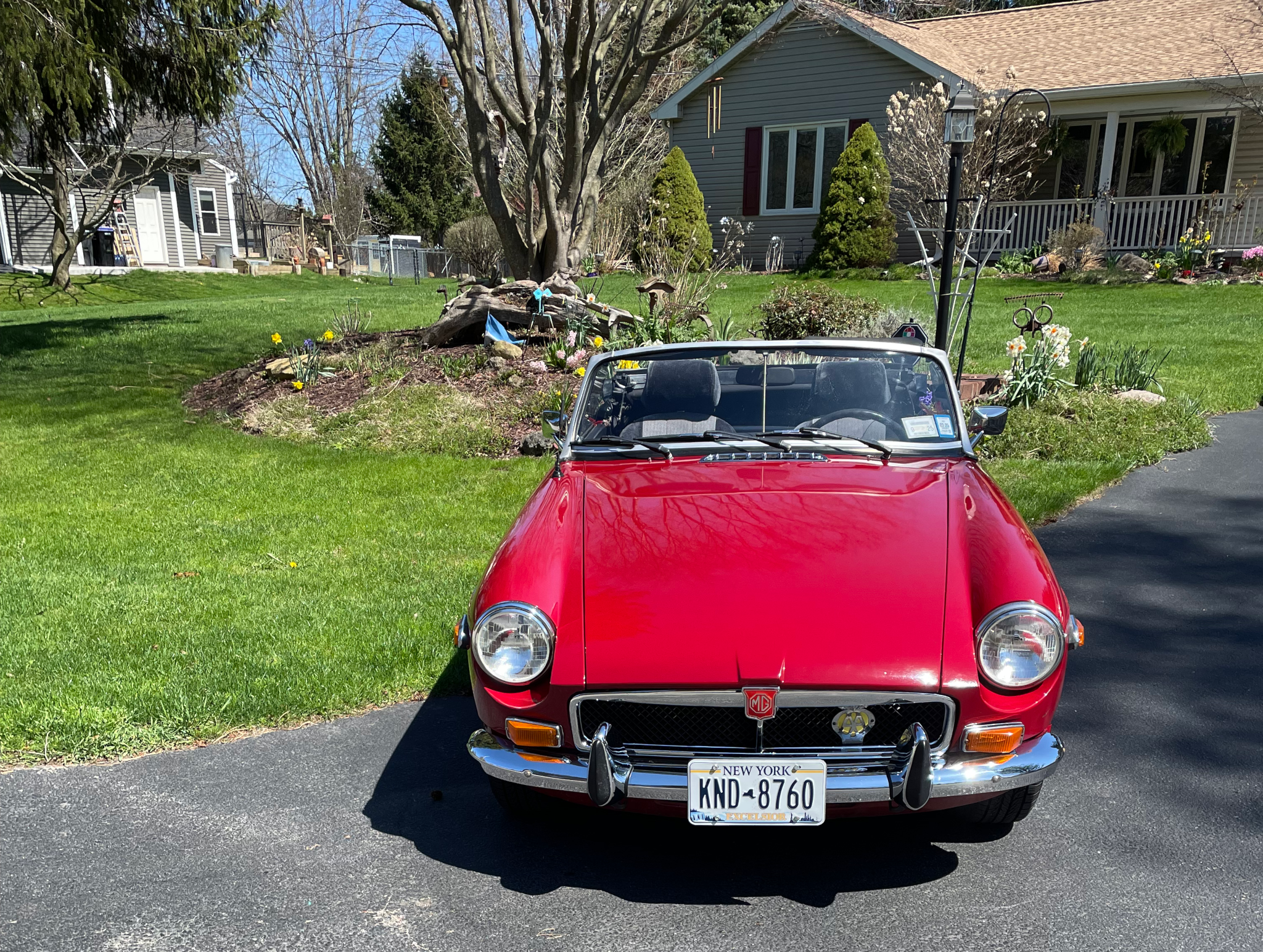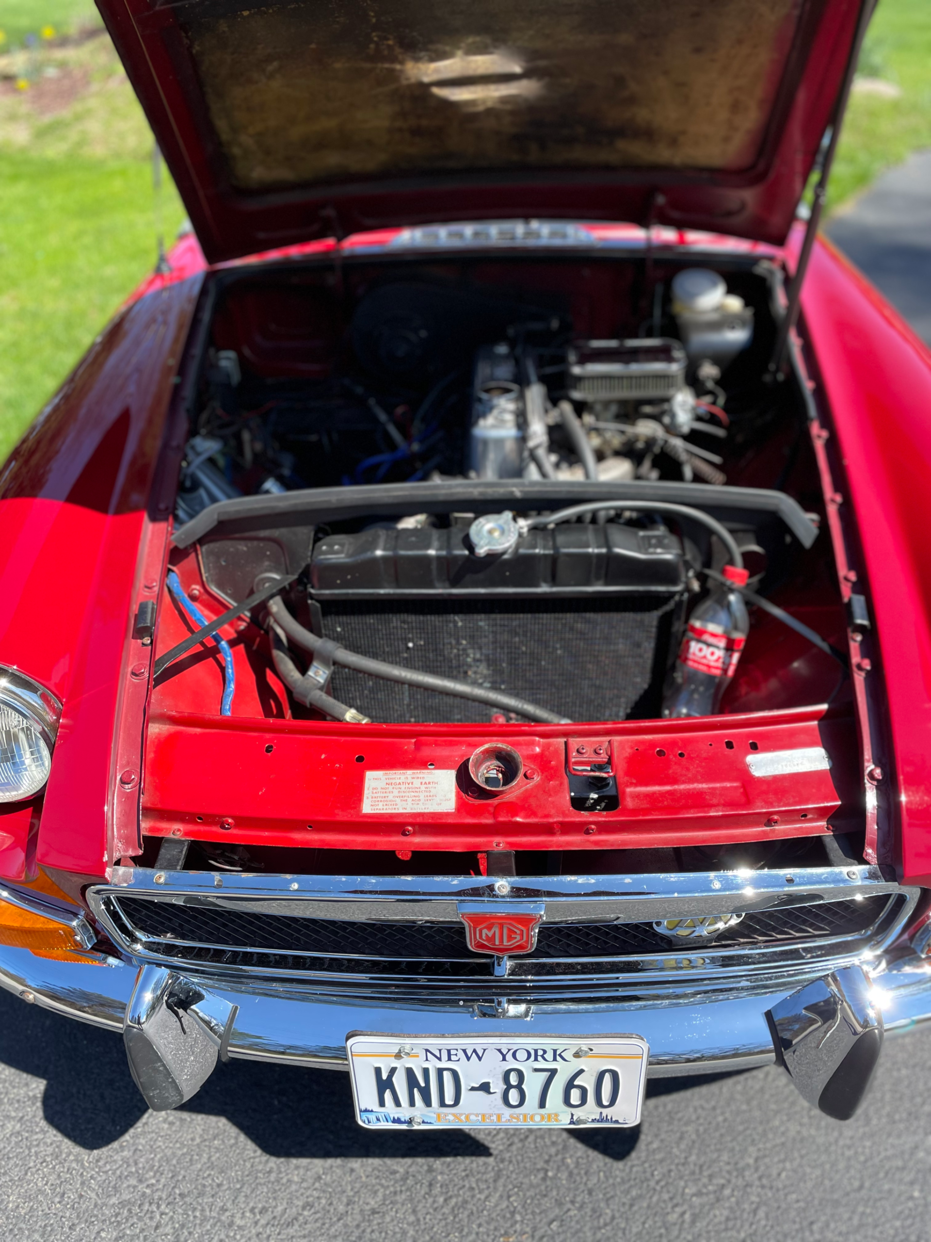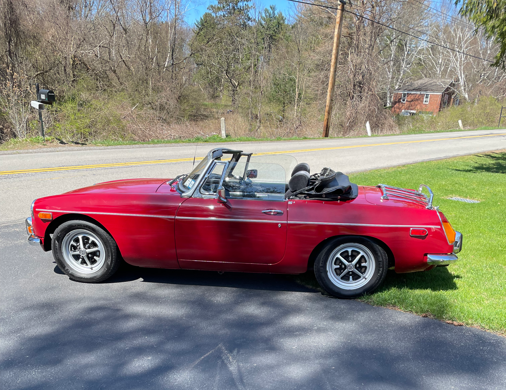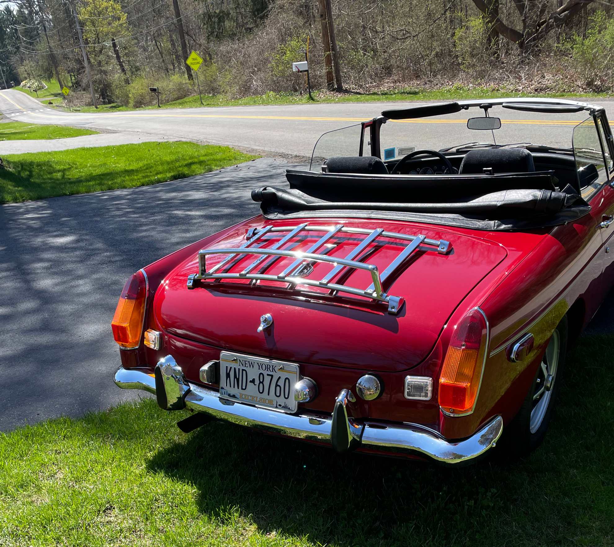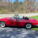 1974 MG, MGB with chrome bumpers, 4 speed manual transmission, and a chrome luggage rack. A full convertible top, roll up windows, Tonneau cover. No radio.