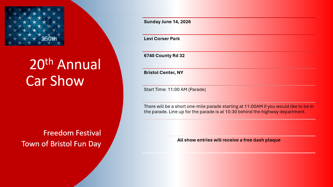 Come and join the fun at Bristol Fun Day’s 20th annual car show on Sunday, June 14th. If you would like to be in the car parade, then please arrive at the Highway Department at 10:30 AM; the parade will start at 11.